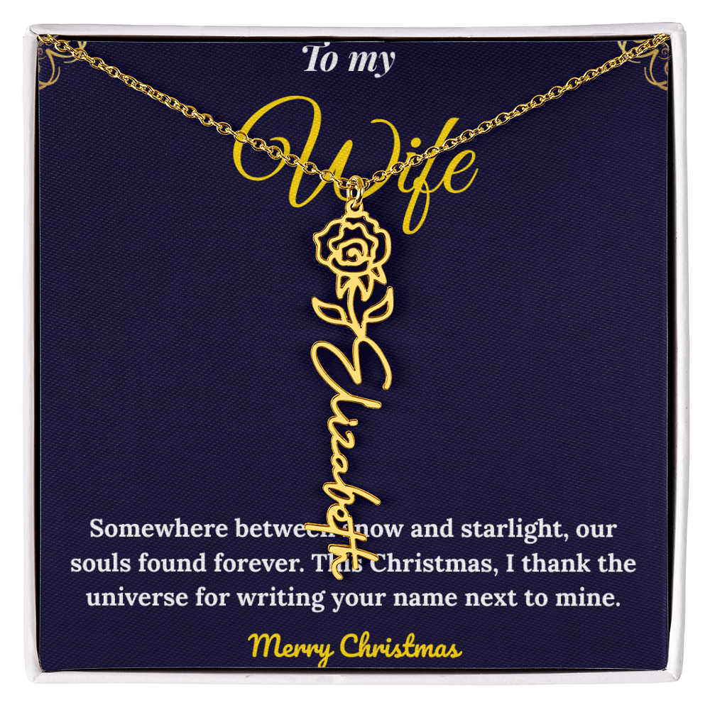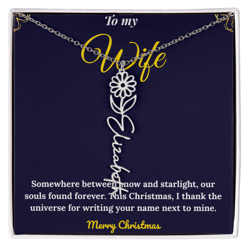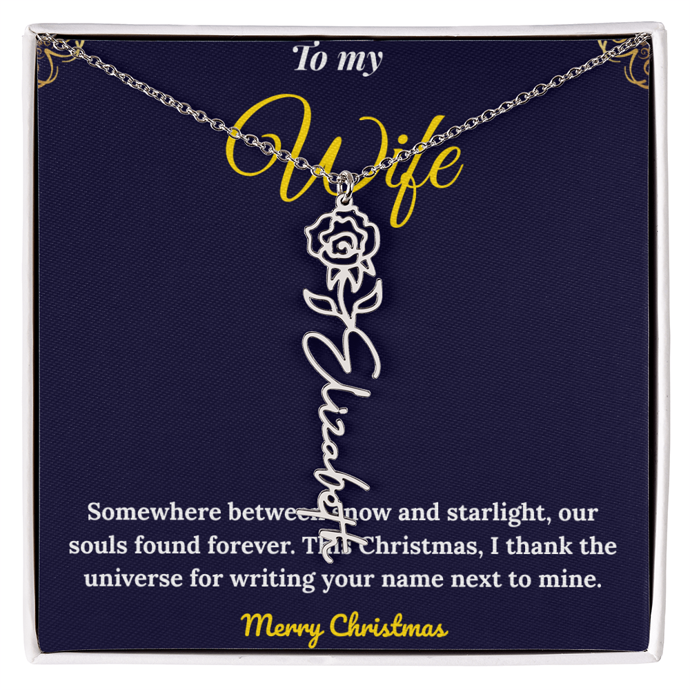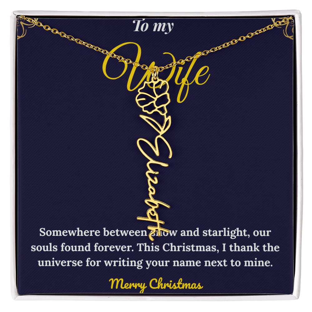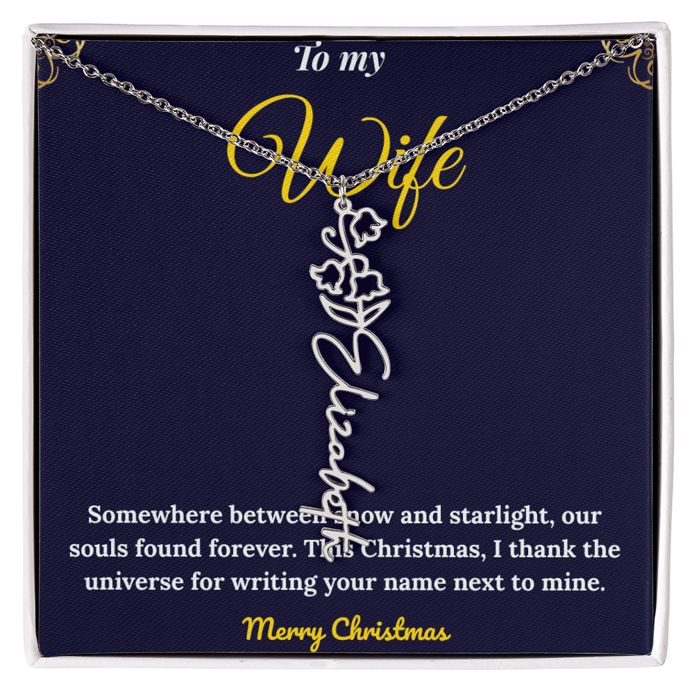 Celebrate love and individuality with our Custom Vertical Name Necklace — a perfect Christmas gift for her. Expertly handcrafted in polished stainless steel or 18K yellow gold, this personalized drop pendant features your chosen name and a delicate birth flower design for a truly meaningful touch. The adjustable 18”-20” chain ensures a perfect fit for any occasion, from festive celebrations to everyday wear. Made in the USA with premium materials, this floral name necklace beautifully blends elegance and sentiment. Create a one-of-a-kind keepsake that reflects her unique charm and makes this holiday season unforgettable.