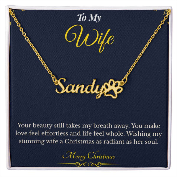 Celebrate the bond between love, family, and furry friends with the Paw Print Name Necklace — a truly heartwarming Christmas gift for your wife that captures devotion in its purest form. Engraved with up to 11 custom characters, this necklace lets you personalize her jewelry with a beloved name — whether it’s her pet’s, yours, or one that symbolizes your shared love story.