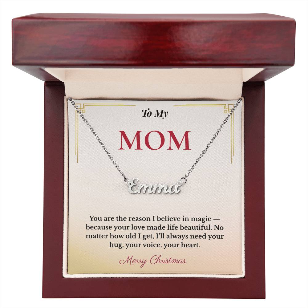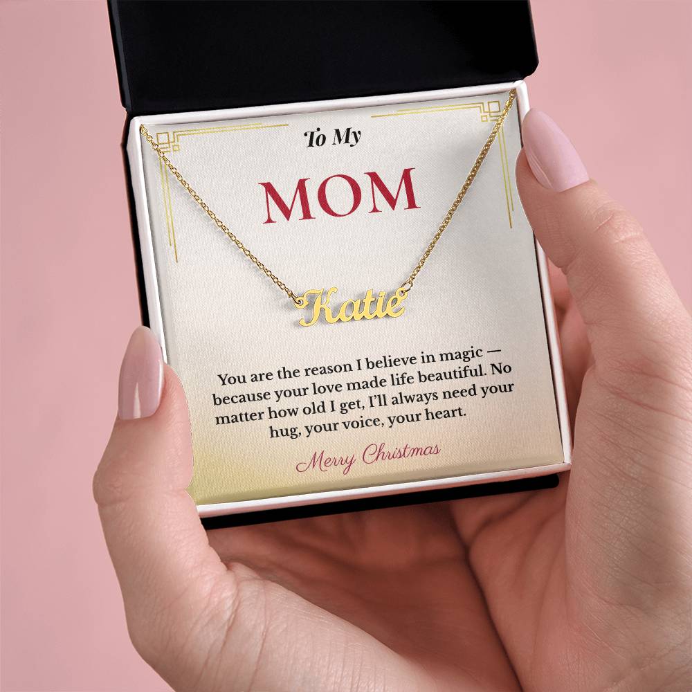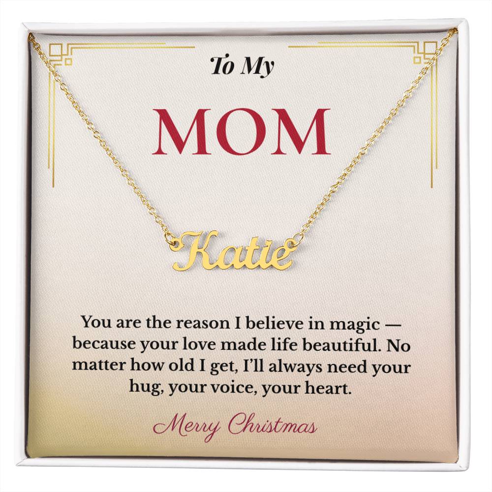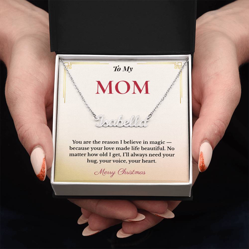 This Christmas, give Mom a gift that carries the warmth of your heart — the Custom Name Necklace, a timeless symbol of love and connection. Beautifully crafted and personally engraved, it transforms her name, or the name of a loved one, into a radiant keepsake she’ll cherish forever.