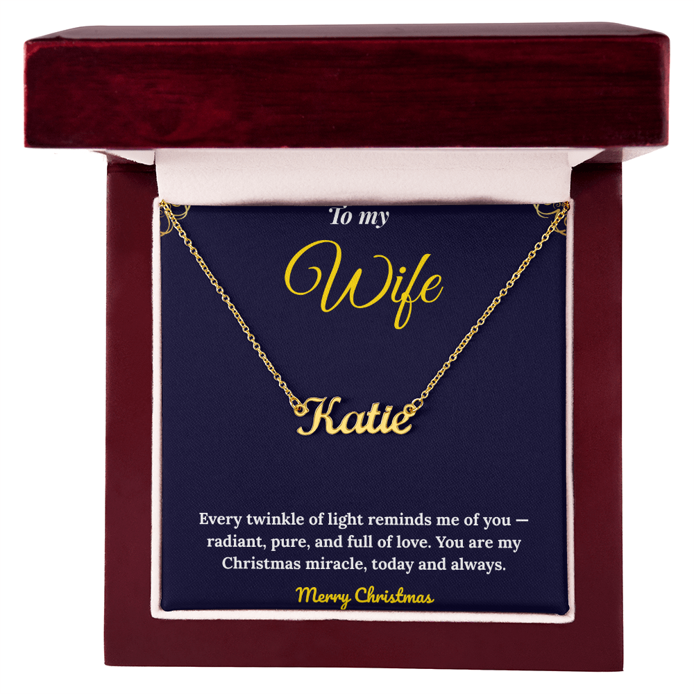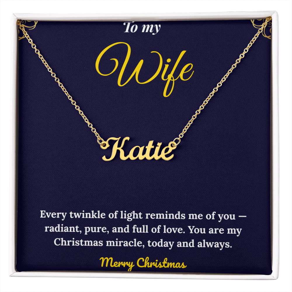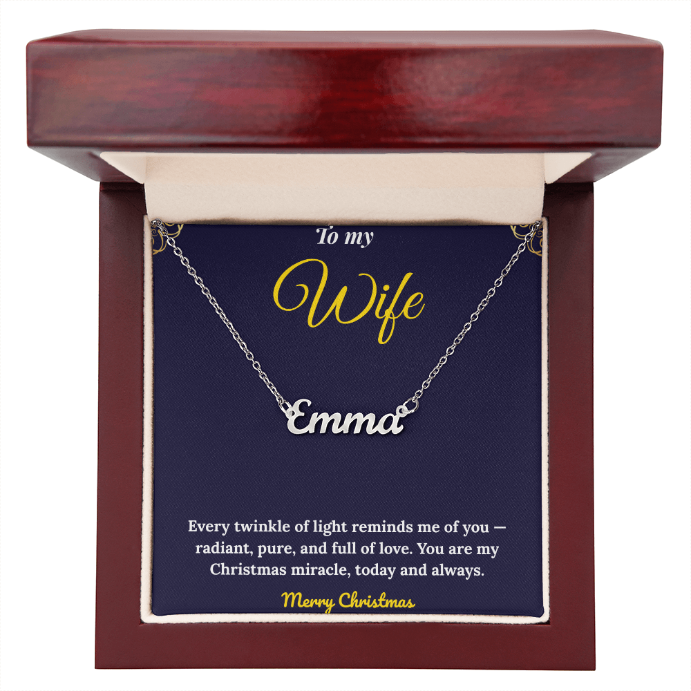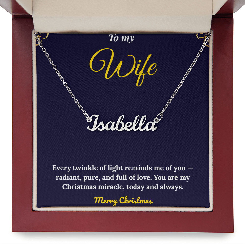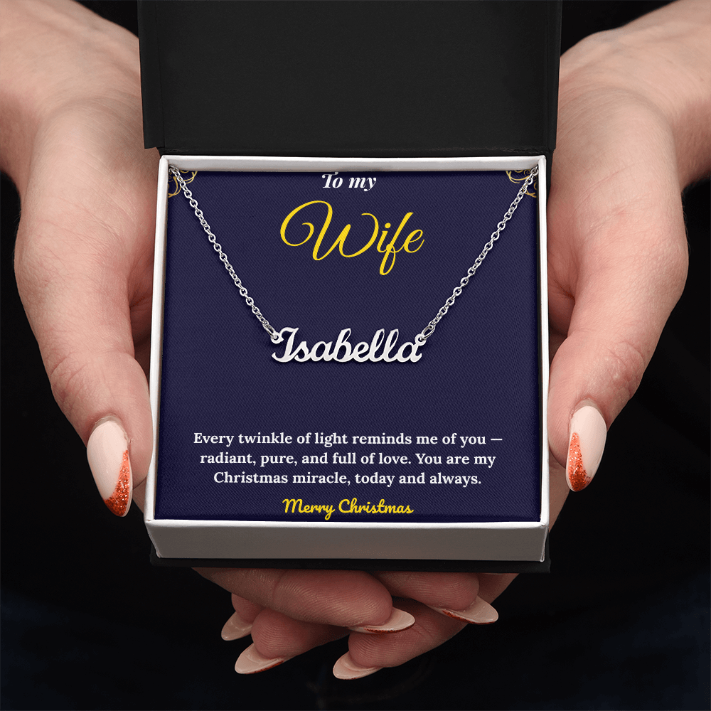 Celebrate your love this season with our Personalized Name Necklace, a timeless piece handcrafted in the USA. Custom-made with your chosen name or word (up to 11 characters), this elegant cursive name pendant is available in 18K gold or polished stainless steel. The adjustable 16”-18” cable chain ensures a perfect fit, making it an ideal Christmas gift for her, anniversary present, or birthday surprise. Each necklace arrives in a complimentary gift box, with an optional mahogany luxury box featuring an LED spotlight for a dazzling presentation. A thoughtful, meaningful keepsake she’ll treasure forever — custom jewelry made with love and style.